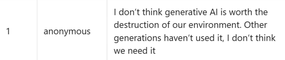 Another student offered environmental concerns: “I don’t think generative AI is worth the destruction of our environment. Other generations haven’t used it, I don’t think we need it.”