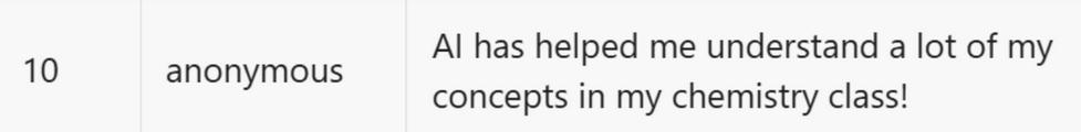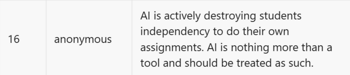 Yet others saw inevitable integration: “The way we learn is evolving. AI is making things easier to understand for some, and easier to access, versus a textbook that may cost too much.” The same student wrote, “If used right, we could help students learn through it.”